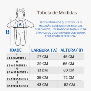 Além disso, informamos que as tonalidades dos macacões podem apresentar pequenas variações de cor de acordo com o lote disponível em nosso estoque. Essas diferenças ocorrem naturalmente no processo de fabricação e tingimento do tecido, sem comprometer a qualidade, o toque macio e o padrão de fofura que você já conhece.